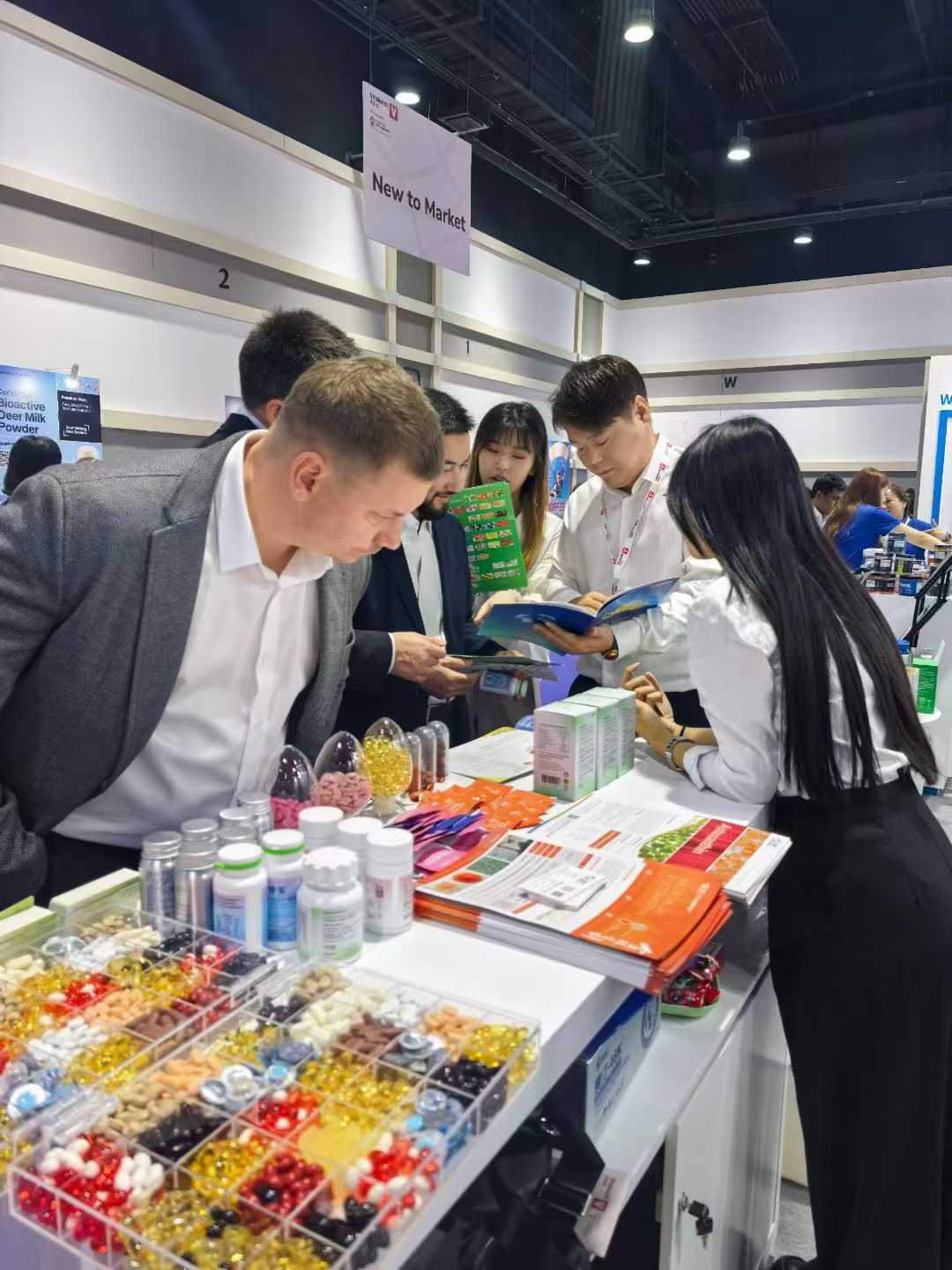 capsule color and packaging specification customization) and "product technical details" (dual-layer capsule structure, active ingredient content). Staff patiently answered inquiries and offered product samples for trial. The product experience area was also packed with people – many Southeast Asian buyers expressed intentions to cooperate on-site, hoping to introduce Run'an Bio’s innovative health products to the local market.